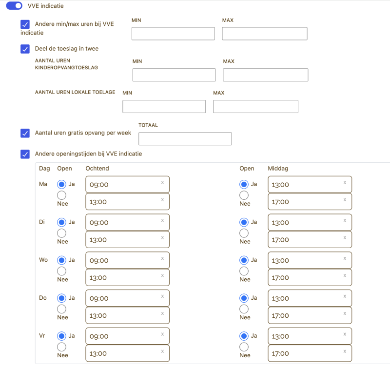 Zodra de ouder in de rekentool de checkbox “VVE indicatie” aanvinkt zijn de bovenstaande toepassingen van kracht