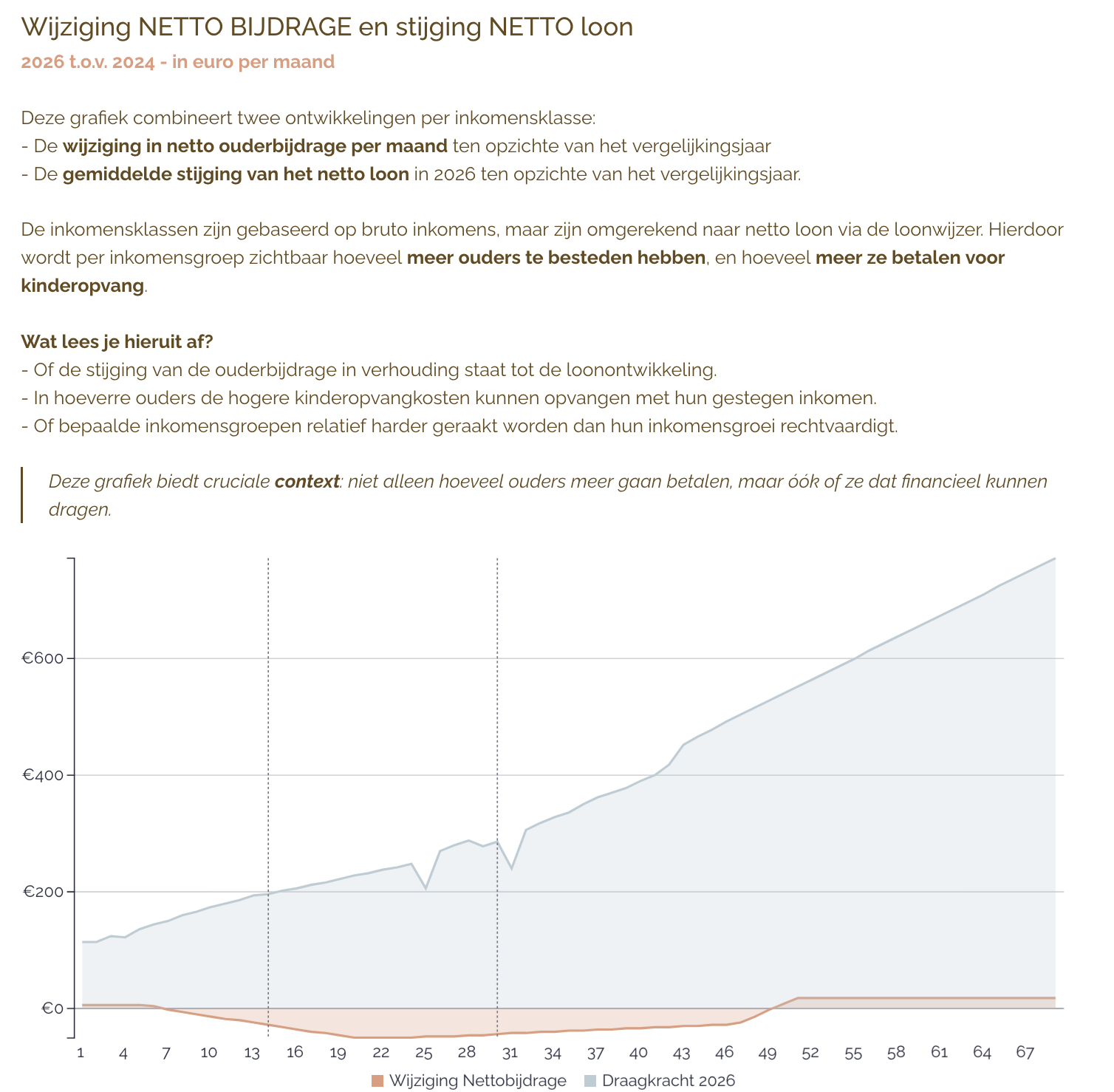 Vergelijk op het einde altijd 2026 met 2025. Dit is namelijk de wijziging die ouders echt concreet merken. Vergelijk 2026 met eerdere jaren (2024 & 2023) om ouders duidelijk te maken hoeveel geld ze voorheen betaalden. Hiermee kan je laten zien dat de correctie bijvoorbeeld niet duurder is dan in 2023 of 2024.