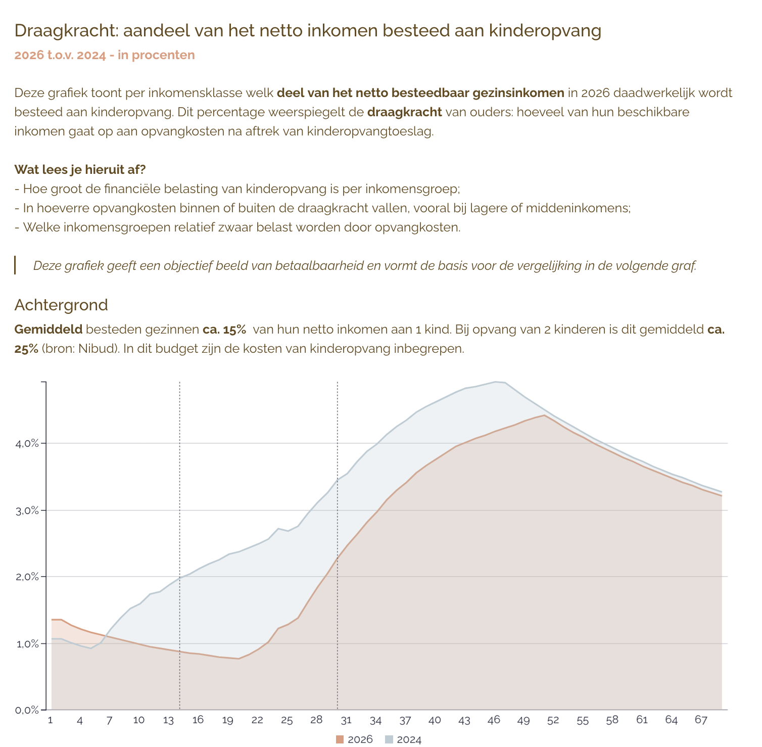 Vergelijk in één oogopslag de netto kosten van alle inkomensklassen tussen 2026, 2025 en 2024. Geef zelf het (fictieve) uurtarief in schep context voor de oudercommissie met betrouwbare data.
