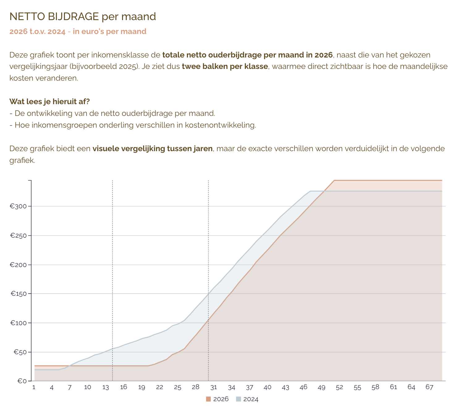 Je ziet allereerst de netto gevolgen van alle inkomensklassen in overzichtelijke tabellen. Hier maken we de onderverdeling in lage, midden en hoge inkomensgroepen. We starten de resultaten altijd met de grafiek inkomensklassen kinderopvangtoeslag om lezers een goed beeld te geven over de inkomenshoogte per klasse. Je kan deze ook nog als tabel downloaden.